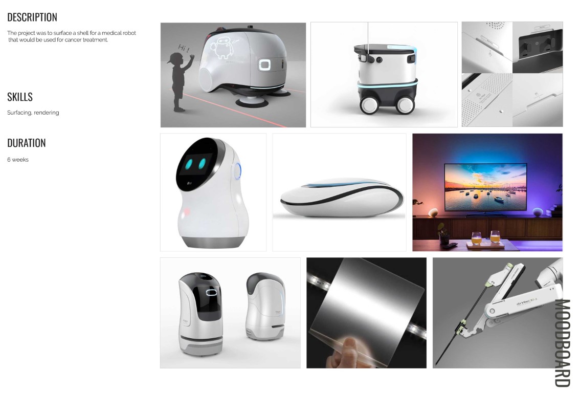 Cancer robot Moodboard Sketches Scenarios Concept Architecture Context Cancer robot Project The project was to surface a shell for a medical robot that would be used for cancer treatment. Techniques Surface modeling, Rendering