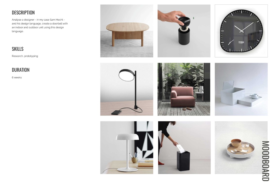Doorbell Moodboard Flow Scenarios Idea generation CMF Final Doorbell Project For this assignment we needed to analyze a designer, research doorbells and build a doorbell consisting of an indoor and outdoor unit, using the designers design language Techniques Research, Prototyping, Rendering
